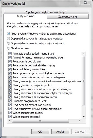 Jeśli pragniesz przyśpieszyć swojego pc'ta możesz wyłączyć nie potrzebne efekty wizualne.Bardzo dużo pobiera sama "przezroczystość" która daje nam niepowtarzalny wygląd pulpitu.