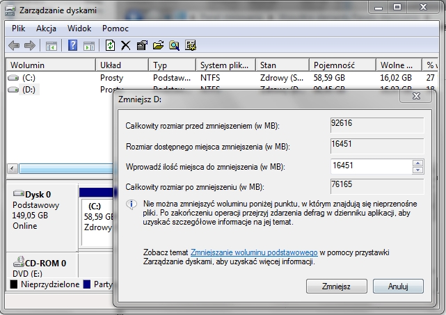 Jeśli pragniesz zmiejszyć,którąś partycję zaznacz i kliknij prawym przyciskiem na opcję "Zmiejsz wolumin" i do dzieła!