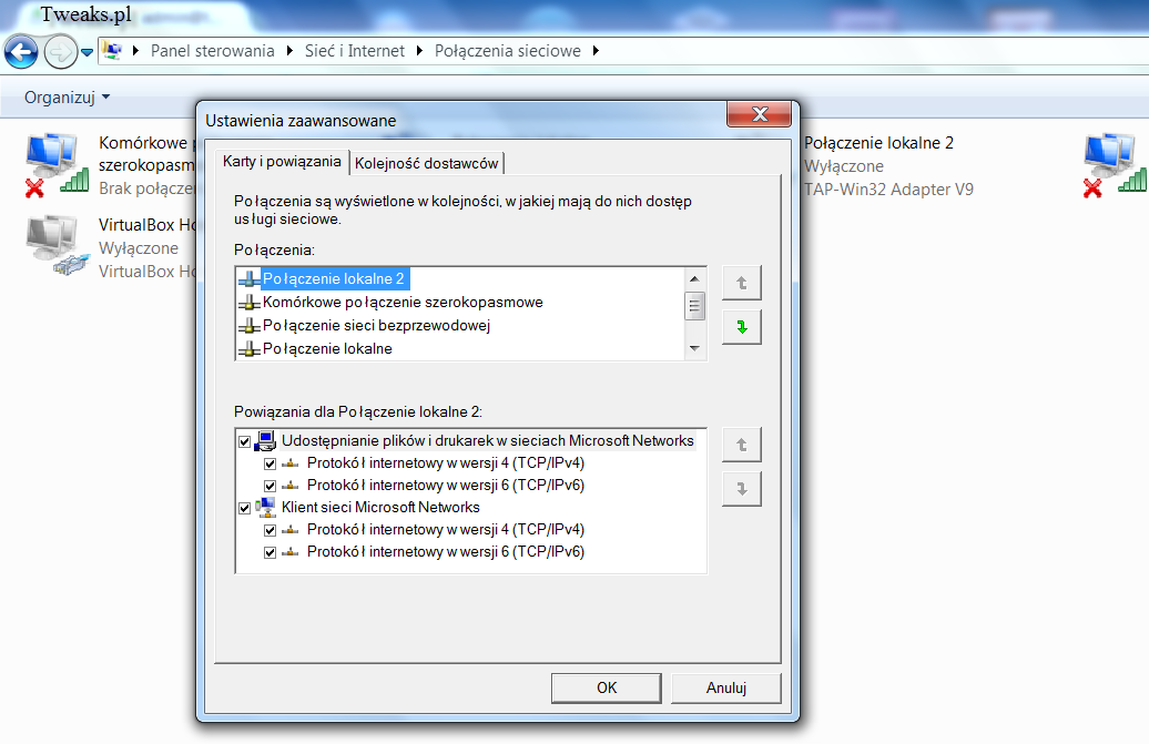 Dostępne połączenia można zobaczyć w sekcji Sieć LAN lub szybki Internet w oknie Połączenia sieciowe. - W menu Zaawansowane (pokaże się po kliknięciu lewego ALT w oknie) kliknij polecenie Ustawienia zaawansowane, a następnie kliknij kartę Karty i powiązania.