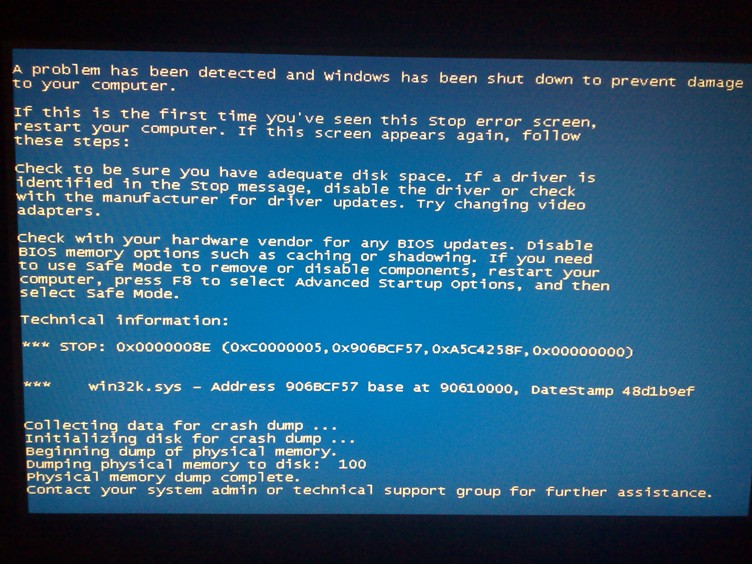 ! Najczęściej w momencie gdy odpalam film. Zaczynam oglądać, wszystko niby fajnie, aż do momentu gdy się pokazuje blue screen... Odlicza sobie do 100 i koniec. Czasem się sam restartuje, czasem zostaje w takiej "pozycji", aż ja do wyłączę i odpalę znowu. Problem najczęściej dotyczy pliku win32k.sys. Zdarzają się też czasem inne, ale głownie właśnie ten. Nie mam zielonego pojęcia, co robić. Próbowałem format, ale to nie zmienia nic. Przypuszczam, że to będzie coś ze sterownikami, które dostałem przy kupnie komputera. Nic nie podkręcałem, nic nie bajerowałem... Nic z tym nie robiłem.